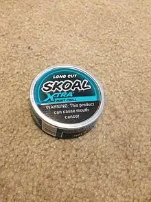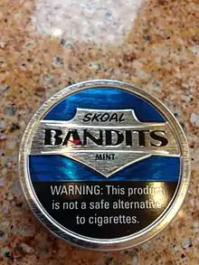 Skoal is packaged in a 1.2 oz plastic can with a metal lid and is available in three textures: fine cut, long cut and two different pouch sizes. Fine cut is more grain-like, while long cut is more string-like. Two pouch varieties of Skoal are also available, Bandits, which are small pouches, and standard size pouches. The tobacco is sealed in a teabag-like pouch, eliminating the problem of tobacco spreading through the mouth. They are also easier to remove, since the tobacco stays in the pouch throughout use. Skoal Bandits are smaller, 1 gram pouches. To compensate for the smaller portion of Bandits, tins of them contain 20 pouches, instead of the standard 15.