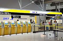 Skymark Airlines Inc. (スカイマーク株式会社, Sukaimāku Kabushiki-gaisha) (TYO: 9204) is a Japanese low-cost airline headquartered at Haneda Airport in Ōta, Tokyo, Japan.[3] It operates scheduled services with a main base at Haneda Airport, but is also the dominant carrier at Kobe Airport,[4] and the only Japanese airline offering scheduled services at Ibaraki Airport north of Tokyo.