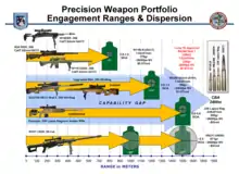 A 2008 United States military market survey for a Precision Sniper Rifle (PSR) calls for 1 MOA (0.3 mrad) extreme vertical spread for all shots in a 5-round group fired at targets at 300, 600, 900, 1,200 and 1,500 meters.[25][26] In 2009 a United States Special Operations Command market survey calls for 1 MOA (0.28 mrad) extreme vertical spread for all shots in a 10-round group fired at targets at 300, 600, 900, 1,200 and 1,500 meters.[27][28] The 2009 Precession Sniper Rifle requirements state that the PSR when fired without suppressor shall provide a confidence factor of 80% that the weapon and ammunition combination is capable of holding 1 MOA (0.28 mrad) extreme vertical spread. This shall be calculated from 150 ten (10) round groups that were fired unsuppressed. No individual group shall exceed 1.5 MOA (0.42 mrad) extreme vertical spread. All accuracy will be taken at the 1,500 meter point.[29][30]
