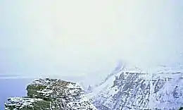 Haslum Crag is a prominent rock crag close to the island's north coast. It stands 2 nautical miles (4 km) northeast of ice-free Station Nunatak, which rises 150 m (490 ft) tall. They were first seen by members of the Swedish Antarctic Expedition (SAE), 1901–04, under Otto Nordenskiöld, and surveyed by the Falkland Islands Dependencies Survey in 1952.[7][8] Nordenskiöld named Station Nunatak because of its proximity to the expedition's winter station, and he gave Haslum Crag its original name, "Basaltspitze".[8] Concerned that "Basaltspitze" could be mistaken for descriptive information, the United Kingdom Antarctic Place-Names Committee changed it to Haslum Crag, honoring H.J. Haslum, second mate on the Antarctic, the ship of the Swedish expedition.[7] This area of the northeast coast consists of Cretaceous sedimentary rocks with abundant fossils of ammonites, gastropods, and bivalves. There are numerous basalt dikes that project up through the sedimentary rocks near the station Nunatak.[9]