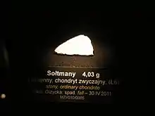 Sołtmany is an L6 ordinary chondrite meteorite which fell on 30 April 2011 in Sołtmany village, Poland. The fall occurred at around 6:00 am. A single meteorite penetrated the edge of a roof and shattered on concrete floor into several pieces. It was immediately found by the owners of the farm, alarmed by the loud noise.
