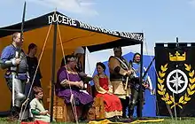 A major dimension to the SCA is its internal system of Heraldry. Any member of the society may apply to register a name and device for their persona, which are checked by the heralds for uniqueness and period authenticity, before being blazoned and recorded in the society's Armorial. The system has evolved since the formation of the society; and now has three Sovereigns of Arms, with Principal Heralds for each Kingdom, who oversee deputy officers for matters such as heraldic education and processing registrations, and local officers (generally one for each local chapter) who assist the local participants.[44] In addition to design of arms, heralds in the Society also provide services such as voice heraldry (similar to a master of ceremonies) at tournaments and official functions, and organizing tournament brackets or "lists."[45]