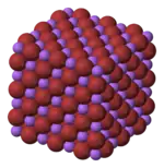 NaBr crystallizes in the same cubic motif as NaCl, NaF and NaI. The anhydrous salt crystallizes above 50.7 °C.[7] Dihydrate salts (NaBr·2H2O) crystallize out of water solution below 50.7 °C.[8]