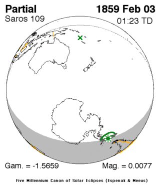 A partial solar eclipse occurred on February 3, 1859 during summer. A solar eclipse occurs when the Moon passes between Earth and the Sun, thereby totally or partly obscuring the image of the Sun for a viewer on Earth. A partial solar eclipse occurs in the polar regions of the Earth when the center of the Moon's shadow misses the Earth.