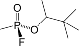 Soman (or GD, EA 1210, Zoman, PFMP, systematic name: O-pinacolyl methylphosphonofluoridate)[1] is an extremely toxic chemical substance. It is a nerve agent, interfering with normal functioning of the mammalian nervous system by inhibiting the enzyme cholinesterase. It is an inhibitor of both acetylcholinesterase and butyrylcholinesterase.[2] As a chemical weapon, it is classified as a weapon of mass destruction by the United Nations according to UN Resolution 687. Its production is strictly controlled, and stockpiling is outlawed by the Chemical Weapons Convention of 1993 where it is classified as a Schedule 1 substance. Soman was the third of the so-called G-series nerve agents to be discovered along with GA (tabun), GB (sarin), and GF (cyclosarin).