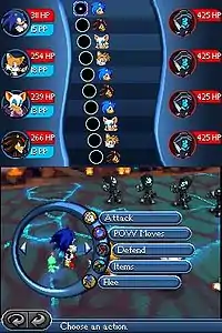 Combat gameplay occurs when enemies are walked into, shifting the view to a close-up for turn-based battles to occur. Standard attacks are available, while special attacks, dubbed POW Moves, can be performed by rhythmically tapping the stylus. These will use up POW Points, in a manner similar to Magic Points in other RPGs.[2] Examples of individual special attacks include Sonic's Axe Kick and Whirlwind, while some group-based special attacks require certain characters in the party, such as the Blue Bomber, which requires both Sonic and Tails.[4] After combat is complete, loot is available, ranging from healing items to character equipment - equippable in one of three slots per character - while experience points boosts up to two of four attributes per character: speed, attack, defense, and luck.[2]