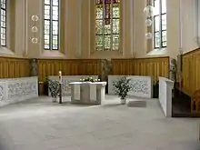 The church was built, according to the custom of the Cistercians, with a ground-level vault next to the choir and nave, which supported the nuns' gallery (Nonnenempore). The choir area was the work of Heinrich Parler but its character was partially lost because of fires and renovations. Among other things, the roof turret, a Parler trademark, was removed. Only a few gravestones have survived from the time of the nunnery: the monuments of Abbess Anna von Henneberg and of knights of the von Schaumberg family. The abbey church became the parish church for the Protestants in 1540. The previous parish church is the present graveyard chapel.