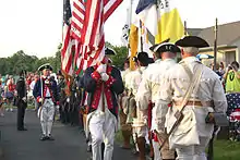 The society is involved in historical research, raising funds for local scholarships and educational awards, and preservation of sites and documents related to the American Revolution. The SAR petitioned Congress to store Revolutionary era documents in a fire-proof area and make them available to the public, leading to the creation of the National Archives.[5] It is also active in cataloging and marking Revolutionary War patriot graves and conducts an annual Eagle Scout scholarship program. The society is active in promoting "patriotism," and was instrumental in the establishment of Constitution Day.[6] Several SAR societies and chapters have active color guard groups that appear in various public and private venues as a means of community outreach.