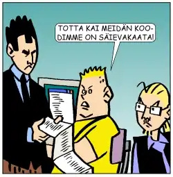 The comic is about a fictional software company and IT industry in general. The setting is somewhat similar to Dilbert, but the style differs by concentrating more on actual nerd trivia and less on business stereotypes and zany interaction between characters. The comic was a pioneer of Finnish webcomics.[1][2] Its site received over 250,000 hits per month in 2007[3] (in a language with 5.2 million speakers), and has been featured in Ilta-Sanomat,[2][4] Iltalehti Online[2] and ITviikko.[2][5] Frequent visiting of the Sosiaalisesti rajoittuneet web site is regarded as a sign of a nerd behaviour.[6]