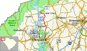 The route of SC 133 travels generally in a south–north direction, beginning at an intersection with U.S. Routes 76 (US 76) and 123 and SC 28 in Clemson. SC 133 passes under a Norfolk Southern railway viaduct and leaves the Clemson area, passing by Lake Hartwell. The highway skirts rural areas west of Central before entering the community of Six Mile. North of Six Mile, SC 133 becomes more rural and hilly in nature before terminating at SC 11, near Lake Jocassee and Devils Fork State Park.[2]
