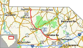 SC 151 starts in Pageland, splitting off from US 601 to bypass the town's business district. Heading southward, it also bypasses Jefferson, heads through downtown McBee, and bypasses Hartsville. In downtown McBee, the speed limit is 20 MPH, and on several segments of the route, the limit is 60 MPH. Past McBee, the route takes on a more east-west direction, which it maintains until its southern terminus in Darlington.[3]