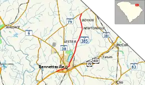 South Carolina Highway 385 (SC 385) is a 11.730-mile (18.878 km) primary state highway in the U.S. state of South Carolina. It connects the city of Bennettsville with northern Marlboro County.