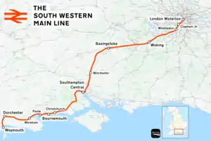 The South Western Main Line (SWML) is a 143-mile (230 km) major railway line between Waterloo station in central London and Weymouth on the south coast of England. A predominantly passenger line, it serves many commuter areas including south western suburbs of London and the conurbations based on Southampton and Bournemouth. It runs through the counties of Surrey, Hampshire and Dorset. It forms the core of the network built by the London and South Western Railway, today mostly operated by South Western Railway. Network Rail refers to it as the South West Main Line.
