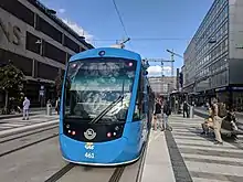 The regular tram service between Sergels torg and Waldemarsudde started on 23 August 2010 with six Bombardier Flexity Classic trams.[1] The cars were at first a dark, almost black, brown colour with gold stripes, as opposed to the traditional light blue trams of Stockholm prior to 1967, however due to complaints this was shortly changed to blue and white. An extension from Sergels torg to T-Centralen opened on 3 September 2018.[2]