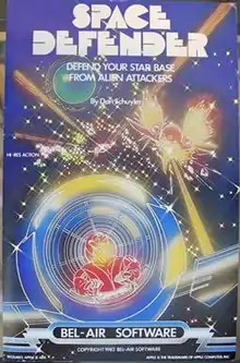 Space Defender is a fixed shooter video game for the Apple II written by Dan Schuyler and published by Bel-Air Software in 1982.[1] It requires an Apple II with a minimum of 48K RAM.