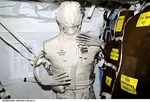 While in space, astronauts are exposed to radiation which is mostly composed of high-energy protons, helium nuclei (alpha particles), and high-atomic-number ions (HZE ions), as well as secondary radiation from nuclear reactions from spacecraft parts or tissue.[6]