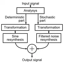 Spectral modeling synthesis (SMS) is an acoustic modeling approach for speech and other signals. SMS considers sounds as a combination of harmonic content and noise content. Harmonic components are identified based on peaks in the frequency spectrum of the signal, normally as found by the short-time Fourier transform. The signal that remains following removal of the spectral components, sometimes referred to as the residual, is then modeled as white noise passed through a time-varying filter. The output of the model, then, are the frequencies and levels of the detected harmonic components and the coefficients of the time-varying filter.