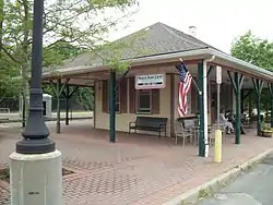 Speonk station was originally built in February 1870 along what was then the Sag Harbor Branch. From 1895–1897 it was known as "Remsenburg station", acknowledging the hamlet of Remsenburg, New York, which lies just south of Speonk. The station was struck by lightning and burned on June 22, 1901,[2] and a second depot opened in December 1901. Railroad conductors frequently accentuated the name when calling it out as the next station. This latter agency and depot were closed in 1958, and the station has been unmanned ever since. The former station was converted into a snack bar that is still operating as the Trackside Cafe restaurant.[3]