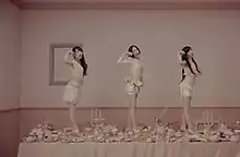 The second chorus has the girls dancing on the table, knocking several pieces of food and Tupperware onto the ground. A-Chan is seen lying down on a pillow, whilst Kashiyuka balances a book and an apple on her head. Both of these scenes have them throwing several pieces of food onto the table. Nocchi is seen at the dining table, holding a fork and listen to music through her headphones. She witnesses a small door underneath a stool, opens it, and sees a small green room. In the room, a blurred image of a cup starts to become clear, and holds small candy. As the girls eat the pieces of candy, their cream-coloured dresses turn into the outfits from the cover sleeve from the single.[15] The girls start dancing in the fish bowl, surrounded by glittery lights. The final scene has the girls looking through the small door again, only to witness the dining room table empty; the small cup with candy appears in beige colouring rather than full-on vibrancy.[15]