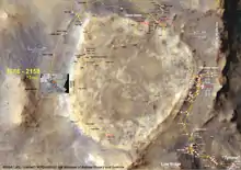 Spirit was targeted to a site that appears to have been affected by liquid water in the past, the crater Gusev, a possible former lake in a giant impact crater about 10 km (6.2 mi) from the center of the target ellipse[24] at 14.5718°S 175.4785°E.[25]