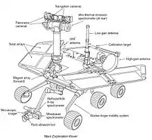 ![]() The Mars Exploration Rover-2 (MER-2) during testing for mobility and maneuverability | |