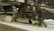 Spirit (and its twin, Opportunity) are six-wheeled, solar-powered robots standing 1.5 meters (4.9 ft) high, 2.3 meters (7.5 ft) wide and 1.6 meters (5.2 ft) long and weighing 180 kilograms (400 lb). Six wheels on a rocker-bogie system enable mobility over rough terrain. Each wheel has its own motor. The vehicle is steered at front and rear and is designed to operate safely at tilts of up to 30 degrees. Maximum speed is 5 centimeters per second (2.0 in/s);[21] 0.18 kilometers per hour (0.11 mph), although average speed is about 1 centimeter per second (0.39 in/s). Both Spirit and Opportunity have pieces of the fallen World Trade Center's metal on them that were "turned into shields to protect cables on the drilling mechanisms".[22][23]
