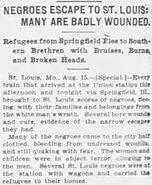 It was noted that "the Negro of Springfield is not the Negro of the South," in that a black man in Springfield had an "aggressive attitude," which he would use to readily argue that he was "just as good as a white man."[2] Corrupt white politicians were said to have contributed to this "arrogant attitude" by giving them city jobs, despite "the majority being lazy, dishonest, vicious, worthless, and genuinely bad."[2] It was reportedly this "attitude" that created a strong dislike against them in among Springfield's white citizens, on par with the dislike of blacks in the South.[2]