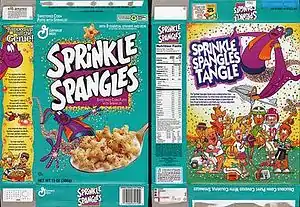 Sprinkle Spangles was a short-lived breakfast cereal by General Mills. It was introduced in the mid 90s, alongside Hidden Treasures. The cereal was of star-shaped pieces covered with multi-colored sprinkles. The commercials claimed that they "Spangled every angle with sprinkles." Sprinkle Spangles were no longer available in 1998.