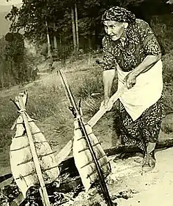 Their geographical territory was abundant in rich food sources from land animals to sea life and plants and animals. For meat, deer, bear, elk, duck, swan, and small rodents such as squirrel. With ocean food it was mussels, sea eggs, cockles, clams, seaweed, herring, trout, crab, urchin, sea lion, seal, all kinds of salmon. For berries and plants, it was different kinds of wild blueberry, blackberry, salmon berry, salal berry, five different kinds of grass and the roots of different plants.[40] Ooligans were once in their river system and Ooligan grease was once made from it. Sea food, particularly salmon was their main staple. It was this abundance of sea food and salmon that their diet was considerably heavy on natural fats and oils. This left relatively small amounts of carbohydrates in the diet. To ensure that essentials vitamins are acquired, they eat almost all parts of animals which they harvest. Ground calcined shells, algae and seaweeds were sources of calcium for Indigenous peoples. Vitamin A is obtained from liver. Vitamin C is primarily found in berries and some other plants. Intestines and stomachs can be eaten to provide vitamin E and the vitamin B complexes. Within the decade following the establishment of Fort Langley in 1827 the Squamish had begun extensive farming of potatoes.[41]