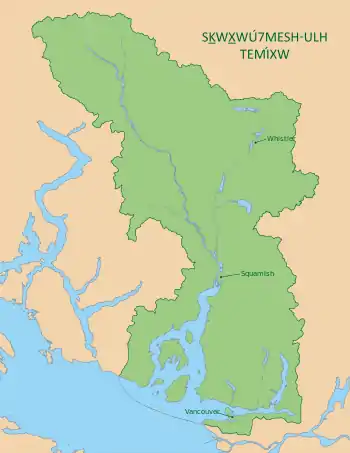 listen, sometimes seen in English as Skwxwu7mesh (The "7" represents a glottal stop), historically transliterated as Sko-ko-mish) are an indigenous people of the Pacific Northwest Coast.[1] In 2012, there was population of 3,893 band members registered with the Squamish Nation.[2] Their language is the Squamish language or Sḵwx̱wú7mesh snichim, considered a part of the Coast Salish languages,[3] and is categorized as nearly extinct with just 10 fluent speakers as of 2010.[4] The traditional territory was in the area now called in southwestern British Columbia, Canada, and covered Point Grey as the southern border. From here, it continued northward to Roberts Creek on the Sunshine Coast, up the Howe Sound. The northern part included the Squamish, Cheakamus, Elaho and Mamquam rivers. Up the Cheakamus River it included land past Whistler, British Columbia. The southern and eastern part of their territory includes Indian Arm, along Burrard Inlet, through False Creek then English Bay and Point Grey.[5][6] Today the Squamish people live mostly in seven communities, located in West Vancouver, North Vancouver, and within and nearby to the District of Squamish.