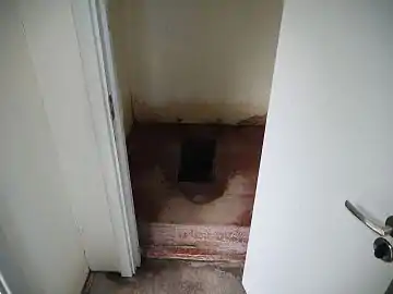Squat pit latrine toilet in Poland. Such toilets are present in some rural areas of Eastern Europe.