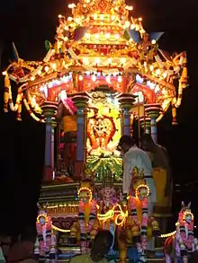 The priceless Lord Subramaniaswamy's statue figures prominently in the annual Chithra Pournami festival when it is borne on a wooden chariot through the city streets to the Arulmigu Sri Balathandayuthapani Hilltop temple in Waterfall, Penang.[19]