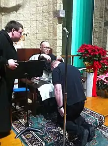 The monks pray Vigils, Lauds, Midday Prayer, and Vespers together in the abbey church. Compline is prayed privately. Lauds and Vespers are chanted and accompanied with organ. Each office includes a hymn. Mass is celebrated daily with Lauds. Lauds and Mass are celebrated at 6:10 am Monday through Friday and at 7:10 am on Saturday and Sunday. Midday Prayer is prayed at 11:45 am daily. Vespers are prayed Monday, Tuesday, Thursday, Friday and Saturday at 5:20 pm. Vespers are prayed at 5 pm on Wednesday and with Benediction on Sunday at 7:30 pm. Vigils are prayed daily at 7:05 pm, except on Wednesday and Sunday when they are prayed privately. The Divine Office is prayed according to a two-week cycle of Psalms from custom-printed office books. The office is presided by a monk-priest or transitional deacon unless designated by the abbot.