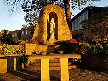 The grounds feature a Marian grotto and a Sacred Heart and Saint Michael statues. The property also contains Benedictine High School and a practice field.