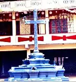 As a village which once had snakes of myriad shapes and venom crawling all over, its residents reposed their faith in the saint to save them from not just snakes but ghosts, demons and other dangers that lurked in the darkness. The first church in Chandanapally was built in 1810. It was renovated in 1875 and consecrated by his holiness Mar Abdullah, the Later Patriarch of Antioch. The wooden planks for the new church were brought from the kodumon forest. The logs of teak and sandalwood could not be carried to the work site as the big stream of the Achenkovil River connecting Kodumon and Chandanapally had dried up. Miraculously the stream began to run full to the brim in a torrential rain that lasted for days and the heavy logs could easily be carried to the spot in no time. There was a reconstruction in 2000 which is famous for the huge size of its structure. Indo-Sarsanik art of sculpture was used in its construction. It is a blend of Christian, Muslim and Hindu sculptured art, Gothic-style towers, pillars erected according to mathematics and a roof in Persian style, which altogether gives it the beauty of a beautiful sculpture. The new church structure resembles St Peter's Basilica in Rome.[2]