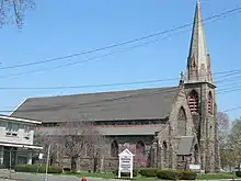 The church building is a one-and-a-half-story structure, three bays wide on the south (front) facade, faced in rough-cut stone. A three-and-a-half-story high tower topped with a broach spire rises from the southeast corner. The side elevations have stained glass clerestory windows.[2]