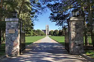 The 25-acre riverside site on which the Seminary stands was donated by Sir Philip Pocock, from a prominent London Catholic family. The Seminary is constructed of Credit Valley stone, and is designed in the Collegiate Gothic style. The cornerstone of the present building was laid by Bishop Fallon on May 31, 1925, and the official opening of the St. Peter's Seminary building was celebrated on September 29, 1926.[4] The main entrance rotunda features a marble statue of St. Michael the archangel, carved in Rome and presented from Bishop Fallon upon the Seminary’s opening.