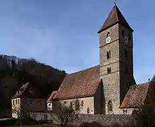St. Peter and Paul is a Gothic church in the quarter of Detwang in the Bavarian tourist resort of Rothenburg ob der Tauber in the Tauber valley. The most important piece of artwork in the church is the crucifixion reredos by Tilman Riemenschneider.