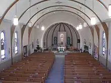 Architect William L. Steele, who died in 1949, may be associated with design of the 1953 building, because he is listed in the National Register database coverage for the property,[2] but the registration document is not available online and there is no mention of him in the parish's own history, which credits architect Loftus instead for the 1953 building. General appearance of the 1953 church might be similar to Steele's works, however.
