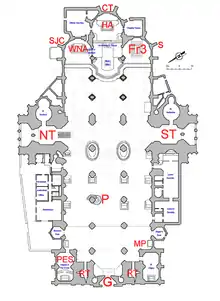 The main part of the church contains 18 altars, with more in the various chapels. The High Altar (HA) and the Wiener Neustadt Altar (German: Wiener Neustädter Altar) (WNA) are the most famous.