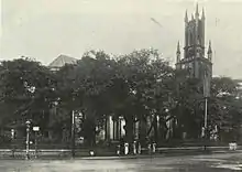 The foundation stone of the church was first laid in 1676, although the church was only finally consecrated for divine service 1718 as the first Anglican church in Mumbai (then called Bombay), within the walls of the fortified British settlement. The Cathedral then lead to the creation of the Cathedral & John Connon School in 1860, in order to provide choristers to the church. The cathedral is a landmark in South Mumbai and is one of the oldest churches in India. It is used by the school for its Founder's Day Service on 14 November every year, Carol Service on the last day before the school's Christmas vacation and other special occasions. The Churchgate railway station derives its name from the St. Thomas Cathedral, as the station was linked to the cathedral by a road way leading through one of the three gates of the fortified island city of Mumbai.[2] The walls of the Bombay Fort were demolished in 1862 and the gate leading to the church was replaced by the Flora Fountain in 1864.[3]