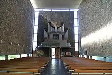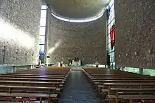 Johannes Krahn, who built several churches and early skyscrapers such as the Beehive House in Frankfurt am Main, designed a space recalling elements of an early Romanesque Basilica. In a simple shape, a single long nave is concluded by a semicircle choir around the altar. The outer walls are sandstone, visible both inside and outside.[1] Light flows in from bands of windows.[1] The combination of materials has been compared to Le Corbusier. The building recalls the austere style of sacred architecture of the 1950s.[1]