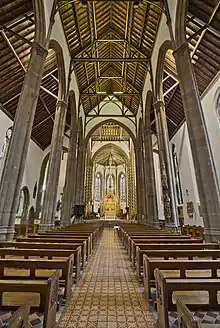 The interior, the nave of which is almost twice as high as it is wide, has a very high arcade, like German hall churches, carried on clusters of thin shafts, those of the chancel being decorated in paint and gold leaf with a helical pattern like a barber's pole, bearing the legend Sanctus Sanctus Sanctus Dominus Deus Sabaoth ('Holy, Holy, Holy, Lord God of Hosts'). The wooden ceiling, with curving blue trusses, is ornamented with monograms and floral patterns, inspired by the remnants of medieval decoration to be found on the ancient ceilings of Ely and Peterborough Cathedrals. Phoebe Stanton describes the ornate decoration of the ceiling as "brilliant" and so delicate that "it resembles fabric stretched over a lattice".[3]