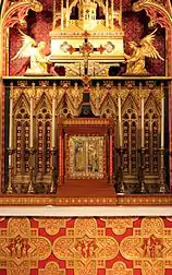 The patron of the cathedral is St Chad, a 7th-century Bishop of Mercia and pupil of St Aidan of Lindisfarne. The cathedral enshrines, in the canopy above the altar, the relics of some long bones of St Chad. These were originally enshrined at, and rescued from, Lichfield Cathedral by Prebendary Arthur Dudley, before its despoliation during the Reformation, in about 1538.[5] Fr Dudley passed the bones to his nieces, Bridget and Katherine Dudley of Russell's Hall, whence they were divided in parcels and passed down among their family. In 1651, Henry Hodgetts, a farmer, of Sedgley was dying and his wife summoned an itinerant priest, Fr Peter Turner, SJ to give him the last sacraments. When they recited the litany of the saints, Henry kept calling upon Saint Chad, pray for me. On being asked why he called upon St Chad, he replied, "because his bones are in the head of my bed". He then instructed his wife to pass the box of relics to Fr Turner for safekeeping and he took them back to the Seminary of St Omer, in Northern France, where he was based.[7]