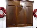 The pulpit is supported by three figures. One is recognizable by the key symbol he holds as St Peter, one by his dress as a Bishop as St Cyprian and the last by the symbols of a book and a broken sword as St Paul.[5]