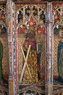 In the interior, the rood screen is considered by many to be the finest in the county. It stretches all the way across the church, and is made up of three separate screens: a rood screen across the chancel arch and parclose screens across the north and south chancel aisles. A 15th century clock jack stands at the west end. He has an axe and bell which he uses to strike the time, and has a twin at Blythburgh.[3] The Southwold jack is named "Southwold Jack", and is one of the symbols of the Adnams brewery. The font has been badly mutilated but is still very impressive with its large ornate cover. The roof in the chancel is painted and its height gives the church a very open feeling.