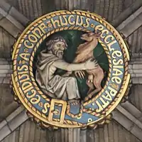 Saint Giles is the patron saint of lepers. Though chiefly associated with the Abbey of Saint-Gilles in modern-day France, he was a popular saint in medieval Great Britain.[11][12][lower-alpha 1] The church was first possessed by the monks of the Order of St Lazarus, who ministered among lepers; if David I or Alexander I is the church's founder, the dedication may be connected to their sister Matilda, who founded St Giles in the Fields.[13]