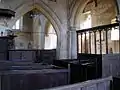 The interior of the church contains wall paintings dating from the 13th to the early 19th centuries,[2] some of which are illustrated in Professor E. W. Tristram's English Wall Painting of the Fourteenth Century.[23] Tristram notes that fragments of a reredos survive with paintings of four saints on them,[24] and he also comments on "crosses of rather elaborate design".[25] Some wall paintings are on crumbling plaster behind painted post-Reformation texts,[17] in places the paint is up to seven layers thick. There are 15th-century angels above the chancel arch and an early 14th-century Doom on the east wall of the north aisle. Victorian texts include the Ten commandments, the Apostles' Creed and the Lord's Prayer.[26] Restoration work on the paintings in 2010 led to access to the church being restricted.[2][27]