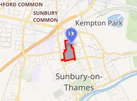 The elegant two-storey, tall-ceilinged house with many windows formed the heart of St Teresa's Convent School and forms the staff and administration building. It is at the end of the Ridings in Green Street and was built during the reign of William IV, that is between 1830 and 1837 to designs by an unknown architect. It is a Grade II listed building. It has a simple Doric porch (portico), central round window and open pediment with two bays to either side. Under John Alliston it became the manor house during a period of the late Industrial Revolution with increasing population in the region, when the products of the manor's agriculture and fishing were insufficient to support the local population. The former manor house close to the Thames was rebuilt in 1851 as Sunbury Park House. These buildings were described as such in a map of 1865.[4] In 1898, it was the home of William Anthony Mitchison, who planted the 1 mile (1.6 km) avenue of horse chestnuts forming The Avenue in the east of his estate. Before the opening of Sunbury Police Station in 1882, Mr Mitchison, who was the local Justice of the Peace (magistrate) had special permission to conduct the court in a room of this grand house.[2][5]