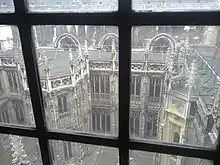 In order to suit the needs of the House of Commons, various changes to the chapel's original Gothic form were made by various architects between 1547 and 1834. Initial changes during the late 16th Century were relatively minor; the original chapel furnishings were replaced, the interior whitewashed and the stained-glass windows replaced with plain glass. More drastic alterations were undertaken by Christopher Wren in the 1690s. During that work the building was significantly reduced in height with the removal of the clerestory and vaulted ceiling while the great medieval windows were walled up, with smaller windows cut into the new stonework. Inside, the walls were reduced in thickness to accommodate extra seating and the addition of upper-level male-only public galleries along both sides of the chamber, and the remains of the medieval interior were concealed behind wainscoting and oak panelling. A false ceiling was installed in the chamber to help to improve its acoustics, the quality of which was important in an age without artificial amplification. The newly created attic space above the ceiling housed a ventilation lantern and was used as the ladies' gallery, although the view down into the chamber beneath through the lantern was severely restricted. More seating was later added for the extra members brought in by the Acts of Union with Scotland (1707) and Ireland (1800). By the 19th century, the chapel's interior had a very bland and modest look in contrast to its former medieval magnificence.[11] Further alterations were made to the exterior by James Wyatt at the end of the 18th Century.